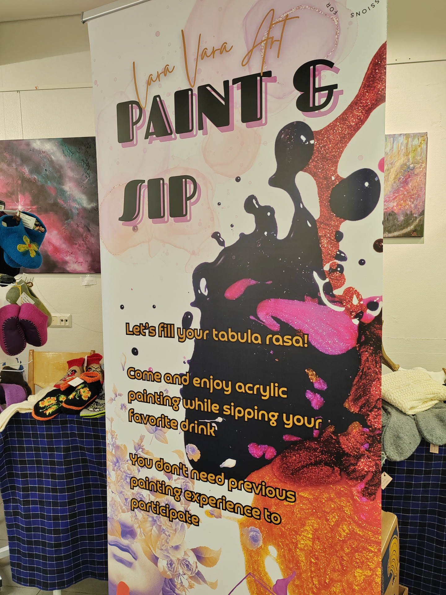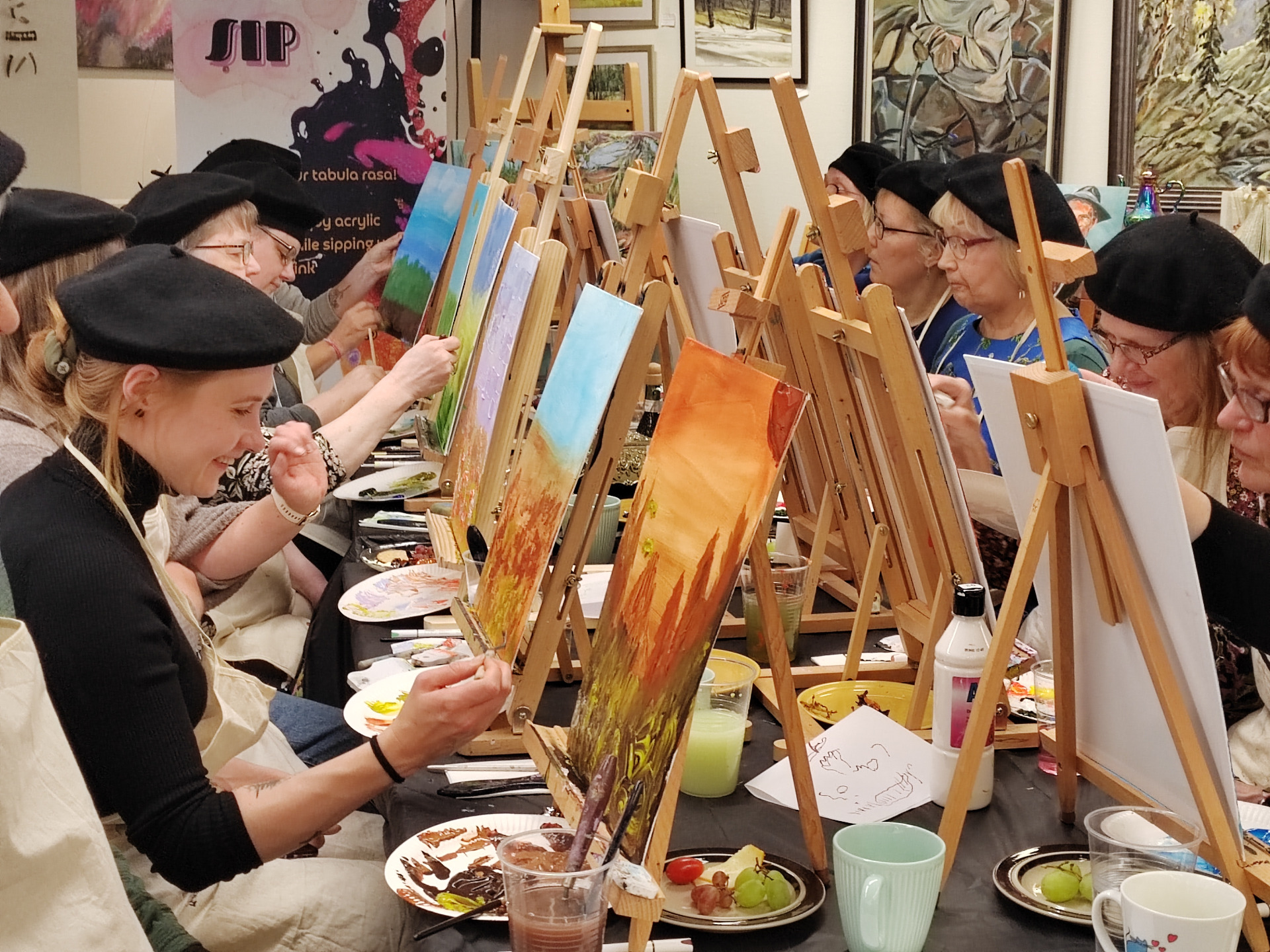 Harrastajataiteilijoiden paint and sip -tapahtuma oli onnistunut ja täynnä innostusta. Tapahtumassa oli 16 osallistujaa, jotka olivat saapuneet valmiina luomaan kauniita maalauksia ja nauttimaan toistensa seurasta. Tunnelma oli iloinen ja rentouttava, mikä loi erinomaiset puitteet luovalle iltapäivän hetkelle.
