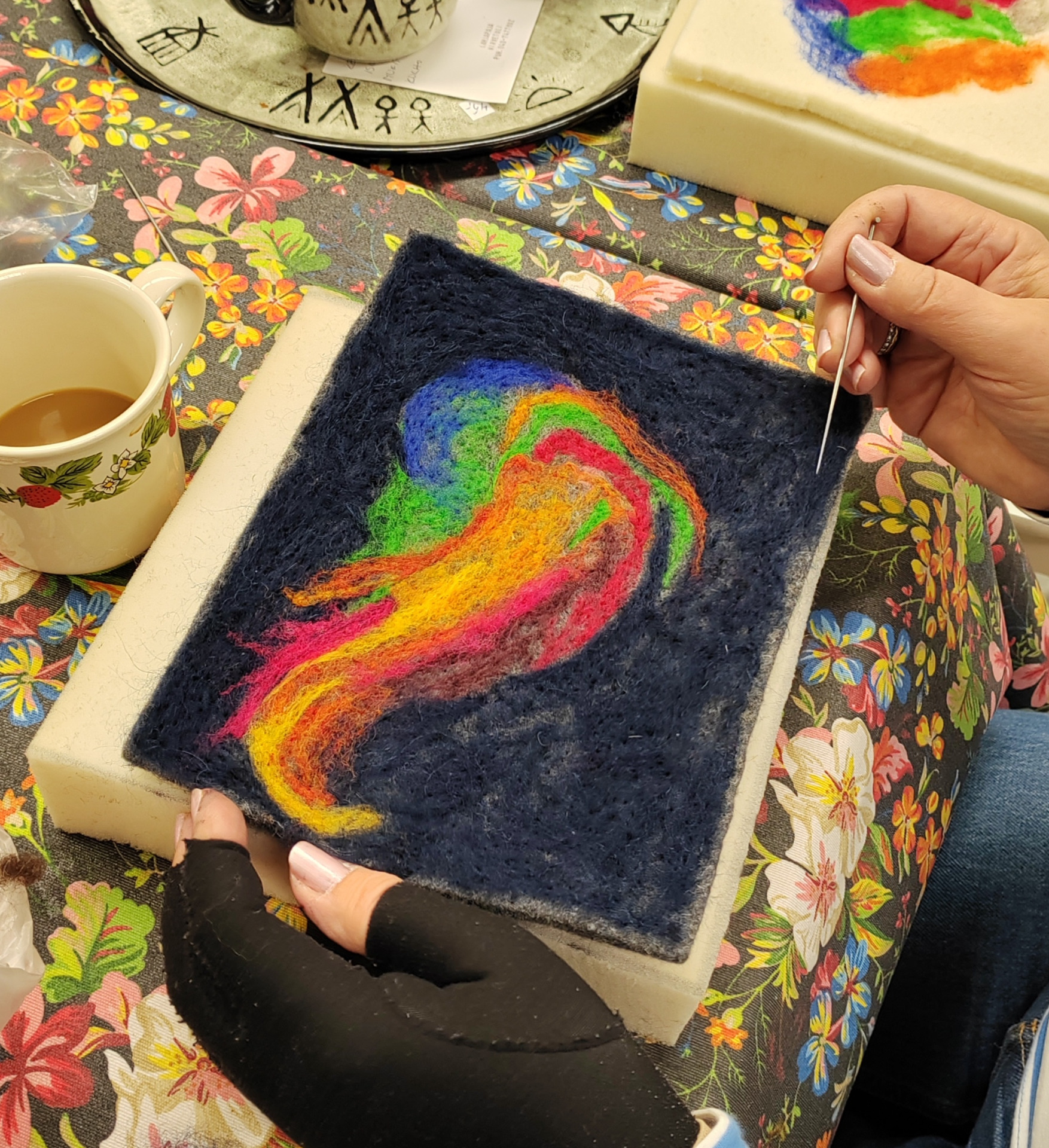 Villamaalaustyöpajassa 20.2. kävi hiljainen puhina, kun joka puolella tikutettiin neulalla villaa huopa-alustaan. Ohjaaja Tarja Lilja kertoi ensin, mistä on kysymys ja sen jälkeen alkoi innokas työskentely. Osallistujien luovuus kukki ja lopputuloksena oli upeita taideteoksia.