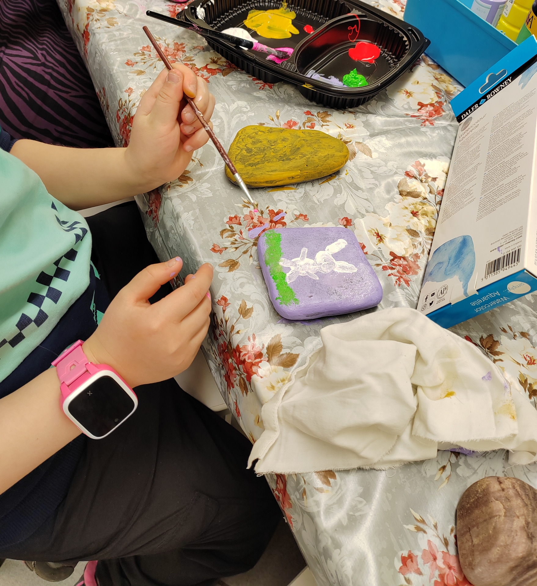 Syyslomalla roiskittiin väriä kivien pintaan. Aihe oli vapaa. Akryylivärit tarttuvat hyvin kiven pintaan ja jos sen vielä kuivuttua lakkaa, maali pysyy kiven pinnalla vaikka ulkona.
